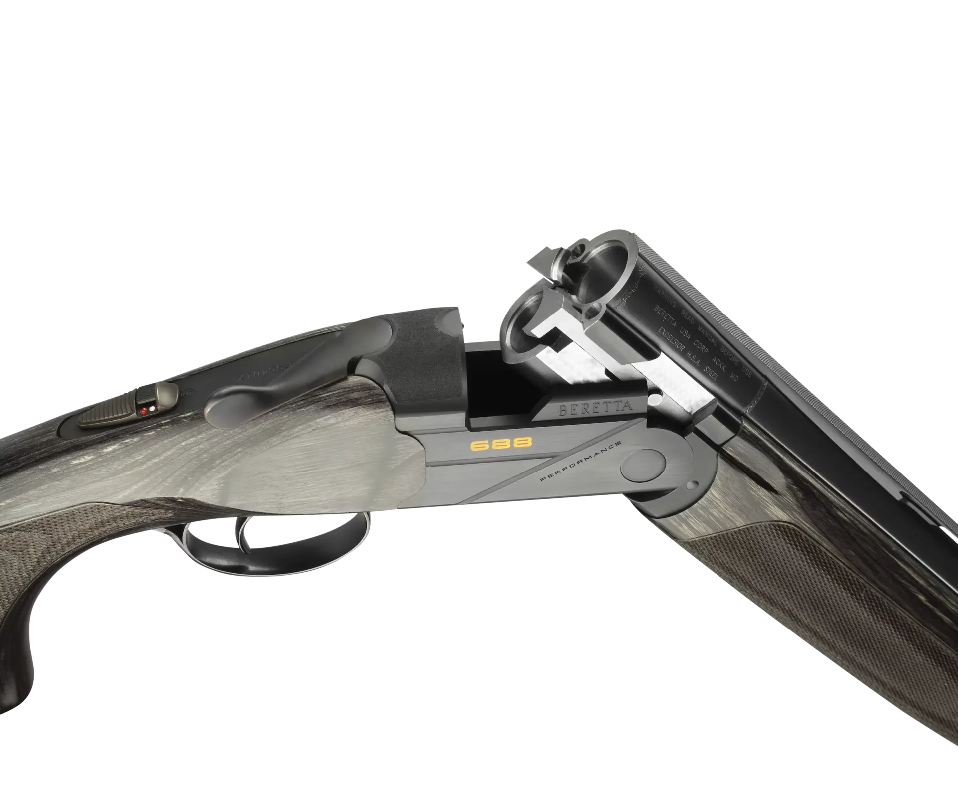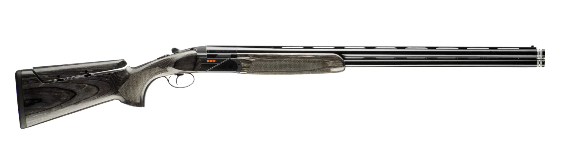The black laminated wood stock, with its sleek glossy finish, not only gives the 688 Performance a modern aesthetic, but also maintains consistent weight and offers superior weather resistance compared to traditional walnut. The blued steel receiver with distinctive orange 688 logo and laser-engraved anti-glare finish completes the modern style of the gun.