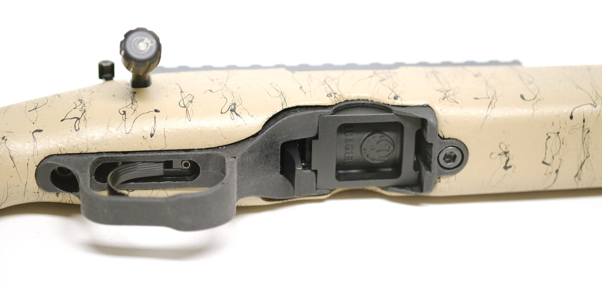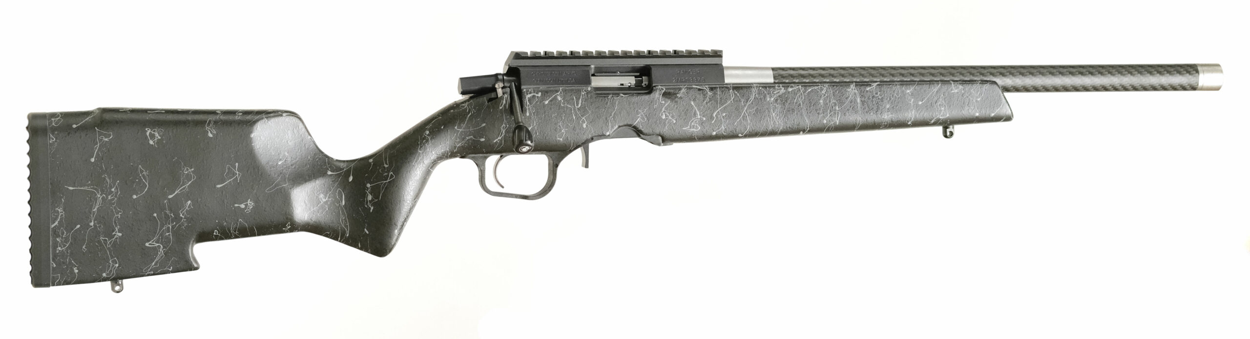 - Stock:Carbon Fiber Composite Rimfire StockPalm SwellAmbidextrous GripRecoil PadFlat ForendSling StudsPalm HookColor