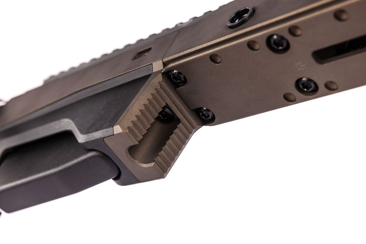 The rifle’s adjustable rear stock enhances shooter comfort and stability through a personalized fit, featuring customizable length of pull, cheek rest, and recoil pad adjustments. The skeletonized rear stock supports additional weights for increased stability. Additionally, an adjustable, ambidextrous thumb rest offers a solid and repeatable rest for thumb-forward grips, ensuring optimal control and performance. The standard pistol grip is adjustable in angle and position to ensure optimal distance to the trigger and comfortable shooting position. The grip is AR-compatible which makes it possible to have customizable grip options.